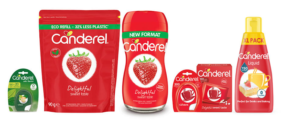 Canderelin tuotteita on saatavilla hienosokeria vastaavana jauheena, kuumien juomien makeutukseen tarkoitettuna puristeena sekä kaakaojuomajauheena. Lisäksi sarjaan kuuluu Canderel Green puriste, joka on luonnonmukainen makeutusaine. Canderel Green puriste on tehty Stevia-kasvin lehdistä saatavasta uutteesta. Tätä luonnon omaa makeuttajaa ovat käyttäneet Etelä-Amerikan alkuperäiskansat jo vuosisatojen ajan.